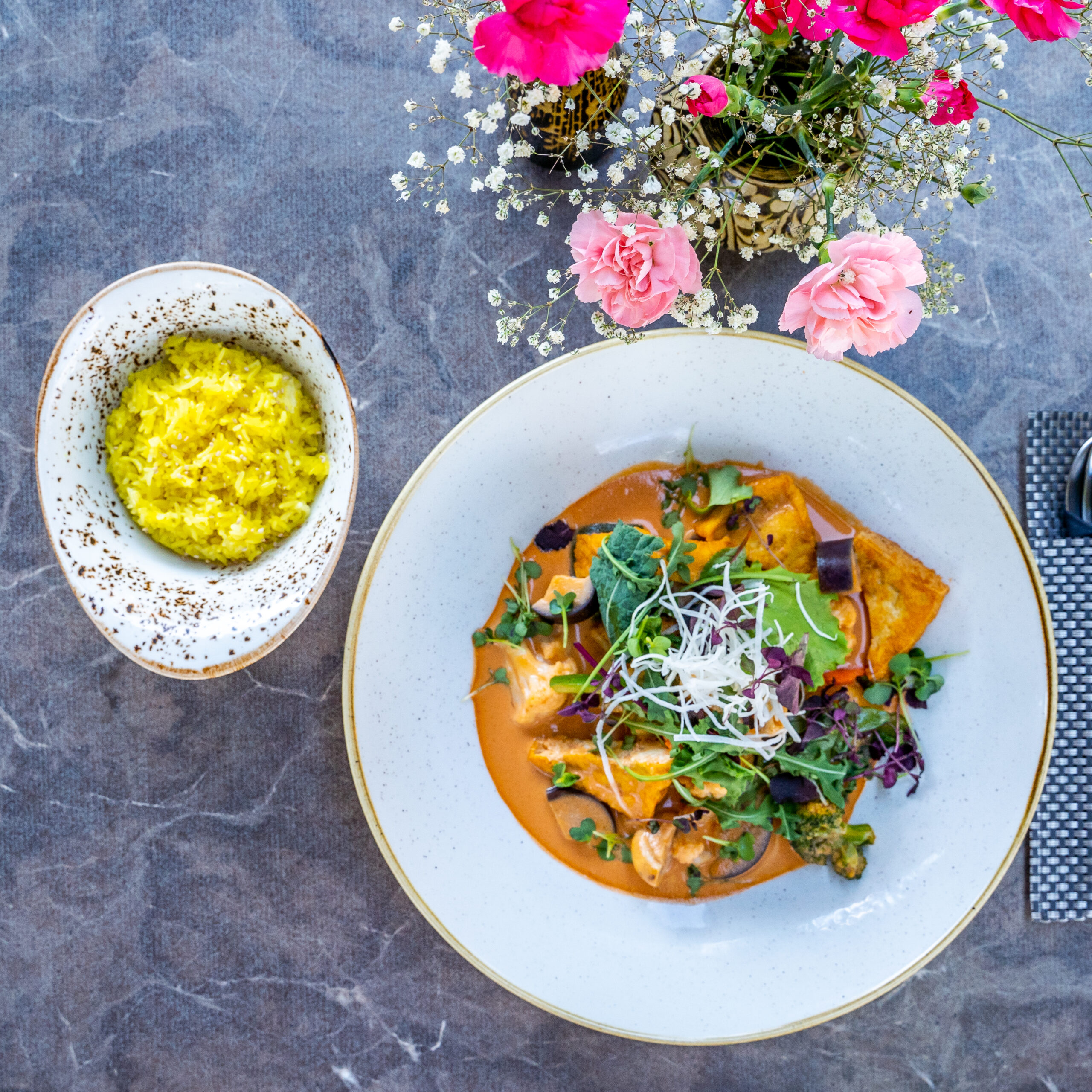 Gebratene Tofu in Currywurze mit verschiedenem Gemüse, Kokosmilch, dazu Reis. Speziell garniert mit Basilikum und Zitronenblättern.