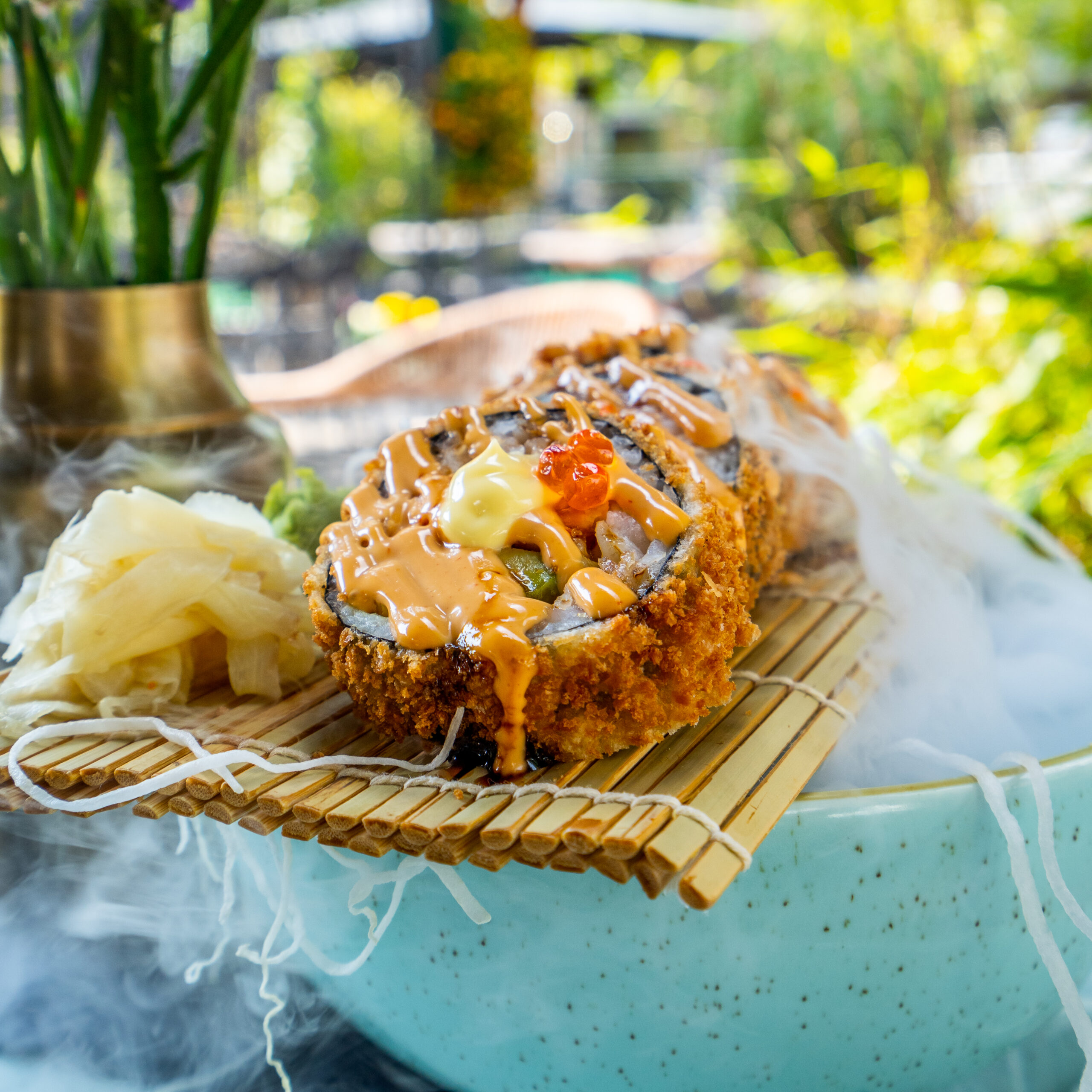 Six crispy tempura rolls with Label Rouge salmon fillet, avocado, golden caviar cream, oshinko, leek pesto, tobiko & wakame salad