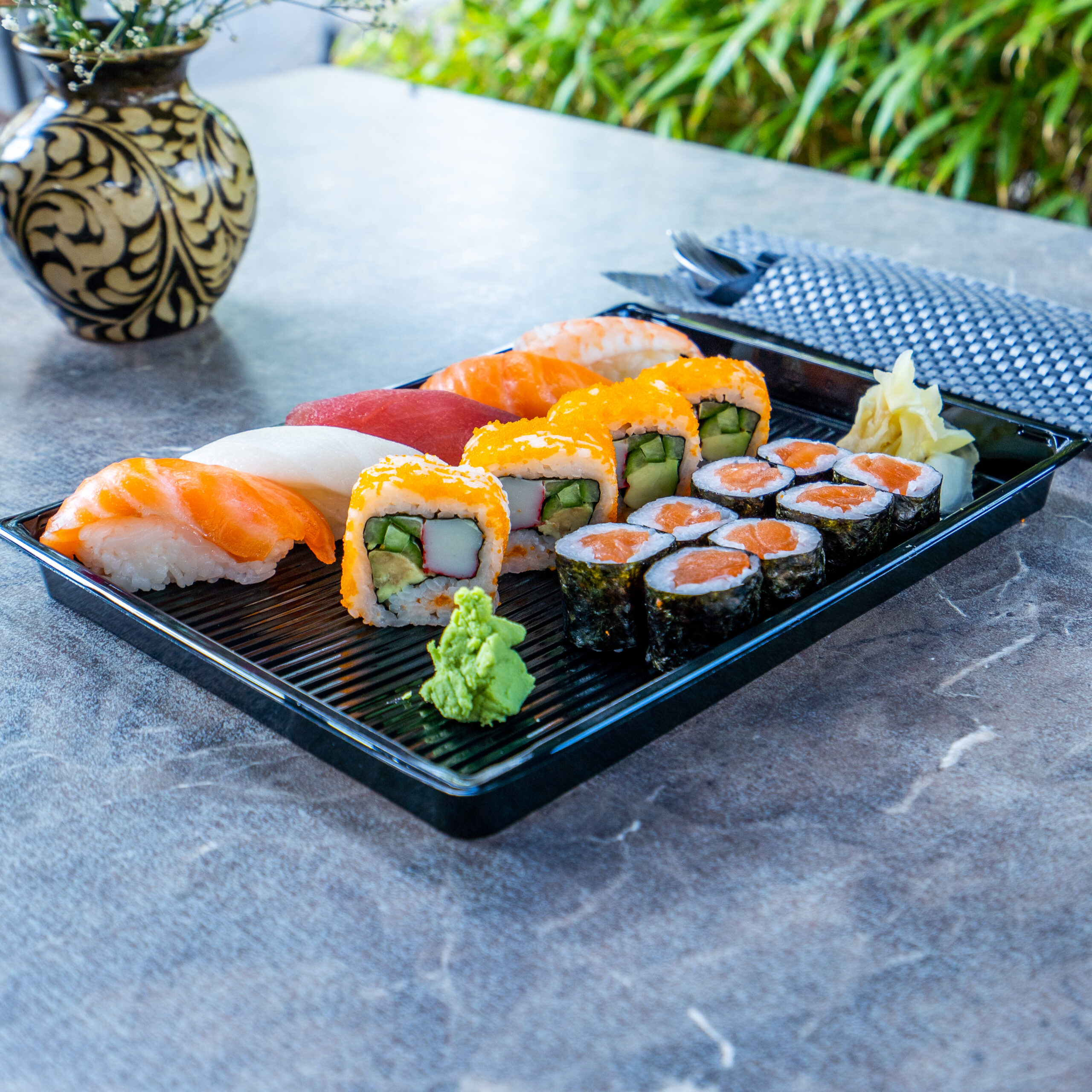 Variations for 1 person: 5 nigiri, 8 maki, 4 inside-out, with a small seaweed salad