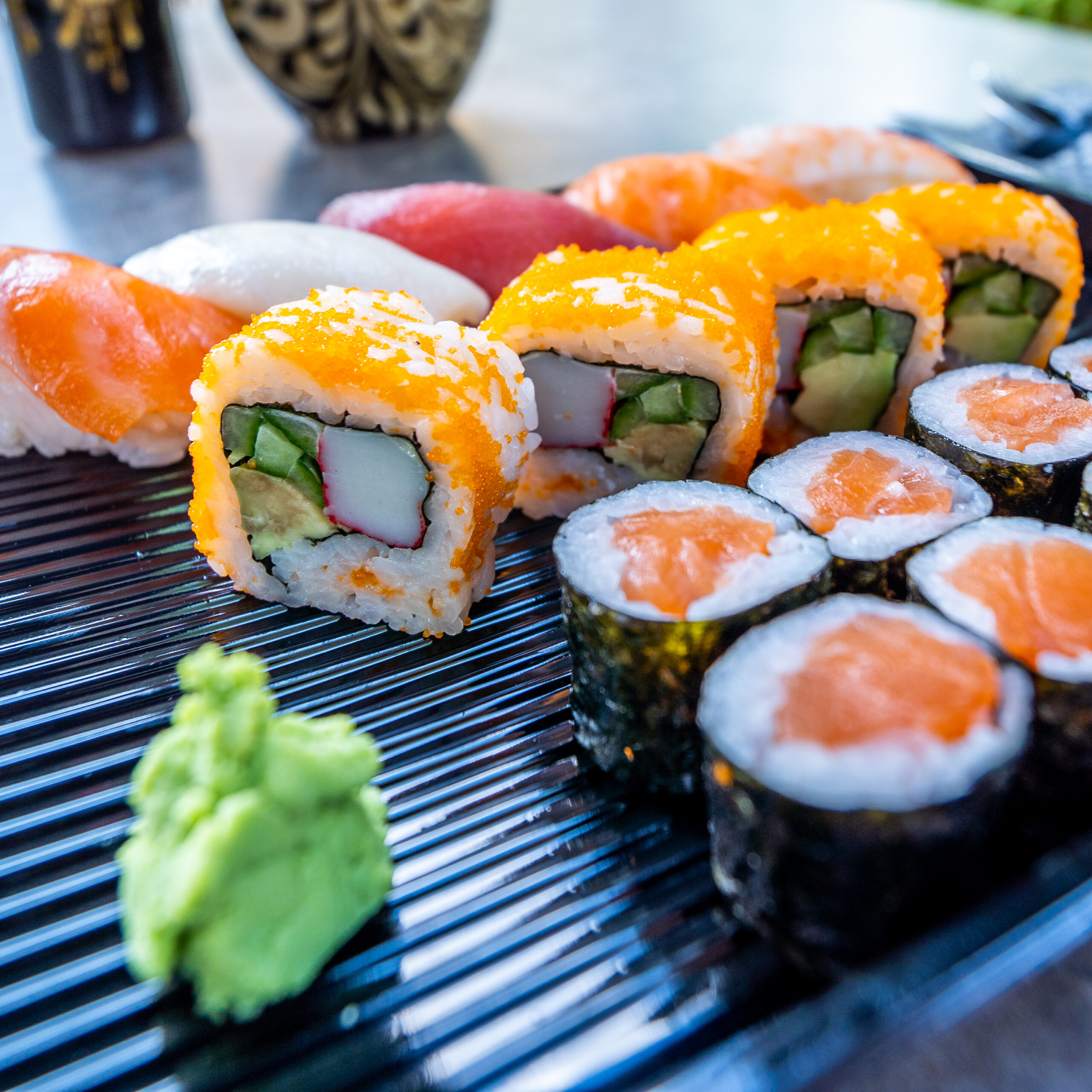 Variations for 3 people: 12 Nigiri, 24 Maki, 4 Inside-Out, 9 Special Rolls, with a small seaweed salad